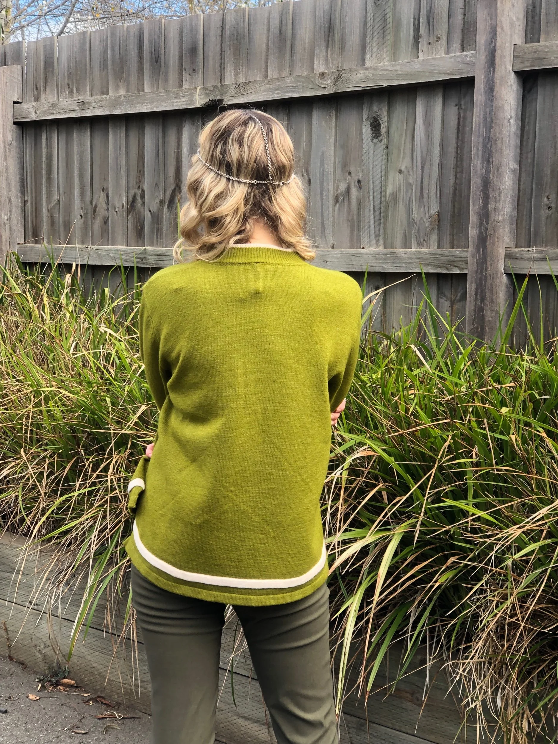Green is the most relaxing colour for the human eye to view and has a healing quality that signifies renewal, hope, growth, nature and life. Warm, comfortable and slightly longer than hip length, the contrasting white bands provide interest and a distinctive loveliness to this garment that begs to be worn as you sip a hot chocolate and share stories and laughs among friends.